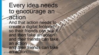 Every idea should encourage participation through an action that leaves a digital footprint for others to see and also take action. An impression alone is not enough, as there is no way for others to share or pass it on to continue spreading the idea. An action creates more impressions through a multiplying effect as friends can continue participating and driving more actions. The document recommends learning how to create ideas that encourage actions in order to increase the reach of campaigns, make them more memorable and create lasting impressions.
