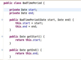 Defensive copying involves making copies of objects passed into methods to prevent the caller from modifying the internal state of the object. It is not needed when objects are explicitly handed off in a constructor or when copying is too expensive, such as with model objects like those used by Hibernate.