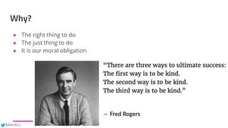 The document discusses making DevOps more inclusive. It argues that diversity improves business performance and that customers will demand inclusiveness. It provides tips for making language, images, products, and hiring practices more inclusive by avoiding problematic terms, showing diverse representations, ensuring accessibility, and revising job postings. Tools like AlexJS and Lighthouse can help detect issues. The key is to take action, even in small steps, and not delay in prioritizing inclusiveness.