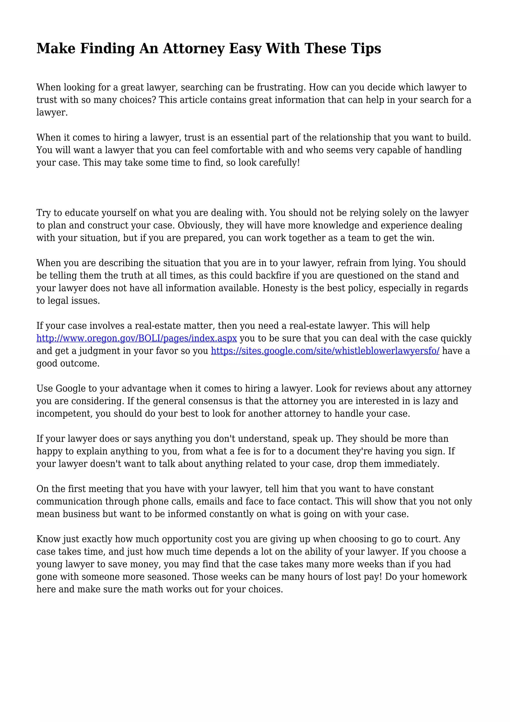 This article provides essential tips for finding a reliable attorney, emphasizing the importance of trust and communication in the lawyer-client relationship. It advises potential clients to educate themselves on their cases, ask questions, and ensure they are comfortable with their lawyer to foster effective collaboration. Additionally, the document encourages thorough research when selecting a lawyer and warns against choosing one based solely on convenience or referrals.
