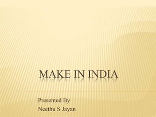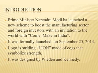 Prime Minister Narendra Modi launched the "Make in India" campaign on September 25, 2014 to boost manufacturing and attract foreign investors to India. The campaign focuses on 25 key sectors and 24 identified manufacturing cities, offering subsidies up to 10% for production of equipment reducing pollution or energy. It aims to simplify decision making and resolve issues within 48 hours through a digital campaign to help foreign investors, take a proactive approach, and ease business regulations to strengthen India's manufacturing sector. Key challenges include existing regulatory clearances, high tax rates, supporting small and medium enterprises, and increasing imports and research and development to compete with manufacturing powerhouses like China.