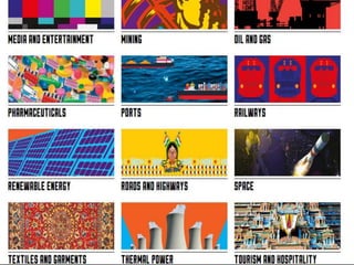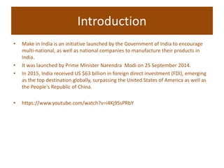 The Make in India initiative was launched in 2014 by Prime Minister Narendra Modi to encourage companies to manufacture in India. It aims to increase manufacturing's contribution to the national GDP from 15% to 25%. The campaign aims to generate jobs, attract foreign investment, and make India a global manufacturing hub. It focuses on 25 key sectors and offers 100% FDI in all sectors except space, defense, and media. The Make in India website provides information on sectors, policies, opportunities, and current projects to attract investors.