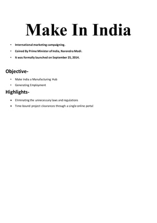 The document discusses India's "Make in India" initiative, which was launched in 2014 to transform India into a global manufacturing hub. It aims to attract investment and foster innovation. 25 sectors are highlighted that the program focuses on, such as automobiles, aviation, biotechnology, defense, electronics, food processing, media, pharmaceuticals, space, textiles, and tourism. For each sector, reasons to invest, growth drivers, FDI policies, and key policies/organizations are summarized. The document also discusses the Delhi-Mumbai Industrial Corridor project and initiatives to improve policies around foreign investment, intellectual property, and manufacturing infrastructure to support the "Make in India" campaign goals.