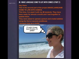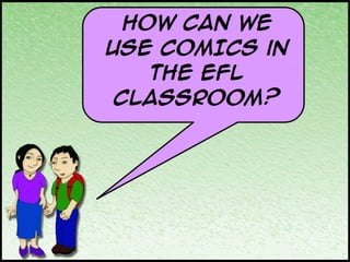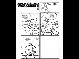This document provides resources for using comics in language learning. It lists several websites for creating comics, including websites for making comic strips, superheroes, monsters, and stick figure videos. It also includes links to classic comic creators and comic worksheets. Comics are recommended for language learning because their reduced text makes them manageable even for beginning readers and provide authentic language opportunities.