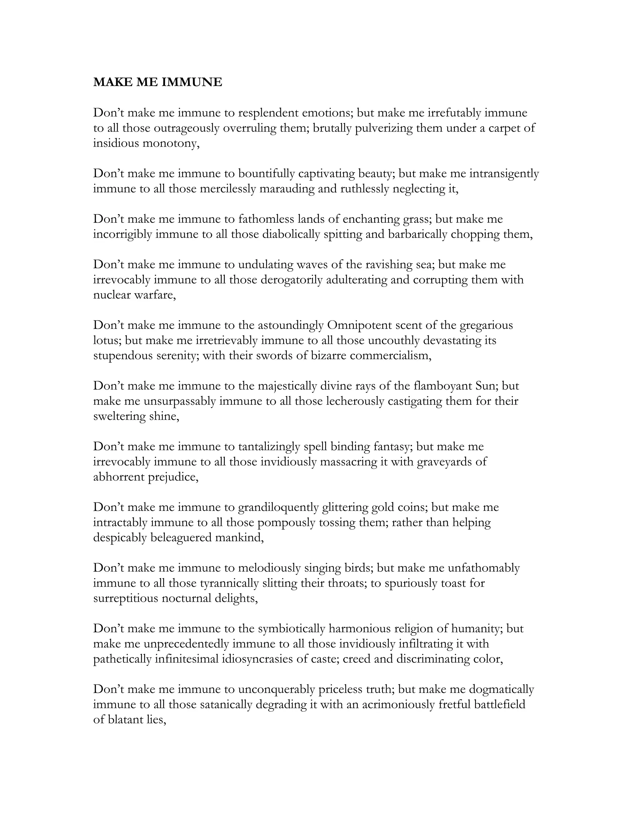 The document is a poem asking not to be made immune to beautiful and meaningful things in life, such as emotions, beauty, nature, religion, friendship, and love. However, it asks to be made immune to those who disrespect, degrade, destroy, or corrupt these things through actions like war, greed, prejudice, cruelty, and hatred. It advocates being immune to those who do not cherish life's most important truths and virtues.