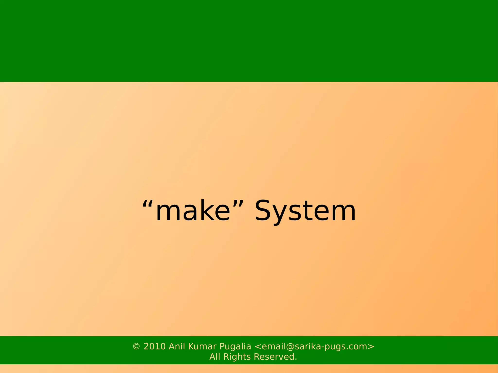 This document discusses the make tool and its usage. Make is used to automatically execute commands based on file dependencies in order to rebuild programs and packages. It is configured using makefiles which specify rules and dependencies between targets. Makefiles allow rebuilding portions of a program automatically when source files change. Examples are provided to demonstrate basic makefile rules and usage of make for compiling C programs.
