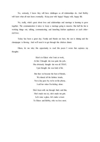 The document contains a humorous maid of honor speech by Mary, reflecting on her deep friendship with the bride, Eileen, and sharing memories of their time together. Mary emphasizes the importance of communication and growth in relationships, humorously acknowledging the challenges that come with marriage. She concludes with a heartfelt poem expressing her love and best wishes for Eileen and her new husband, Bobby.