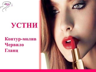 #31 Допълнителната красота на едни устни се постига с помоща на червило.То.....(прочетете)Нанасянето на червилото става...(прочетете)Затова не забравяйте да посочиъе на клиента, че закупивайки си и четка за червило, ще може да го нанесе по-прецизно и то ще стои по-трайно върху устните.