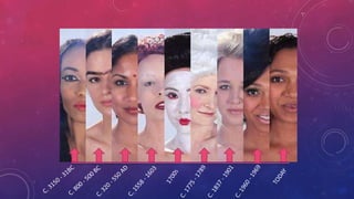 This document discusses the history and timeline of makeup usage from ancient Egypt to modern times. It also covers advantages like improved natural skin tone from reduced usage and benefits of organic makeup products. Disadvantages include skin problems from excess makeup, choosing unsuitable products for one's skin type, and failing to remove makeup at night adding years of appearance.