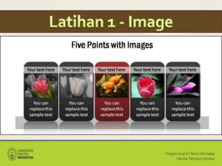 The document provides instructions on creating and formatting illustrations using Smart Art in a presentation. Key steps include inserting shapes, pictures, and text boxes, as well as applying formatting effects like reflections and color adjustments. It emphasizes the process of grouping elements and modifying images for optimal presentation design.