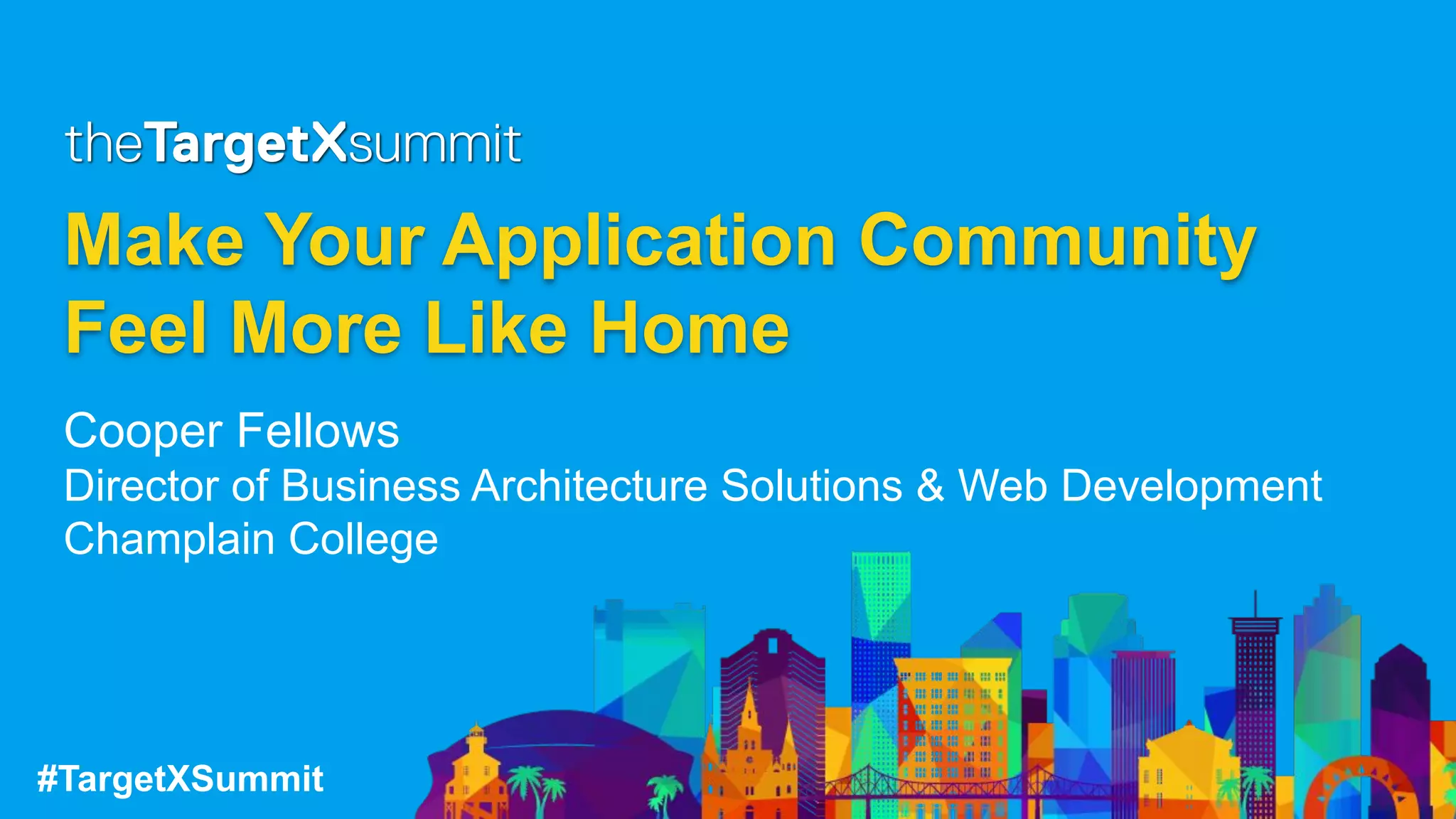 The document summarizes how Champlain College customized their TargetX application system to create a more personalized experience for applicants. They laid the groundwork by setting up a sandbox and relating a custom theme to a new community site. They then built out the site using Visualforce pages, Apex controllers and components, and custom CSS/JavaScript. Finishing touches included personalized application links, marketing analytics, and application helpers like a word counter and favicon. The presenter took questions and shared additional resources.