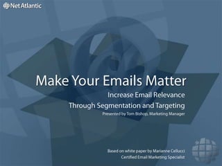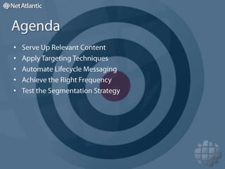 This document discusses how to increase email relevance through segmentation and targeting. It recommends segmenting the market into distinct groups with similar characteristics or behaviors. Applying targeting techniques like using clickthrough, demographic, and other data allows creating focused messages for each segment. Automating lifecycle messaging ensures delivering the right content at the appropriate time and frequency for each segment. Testing segmentation strategies through A/B testing helps optimize the approach and maximize results.