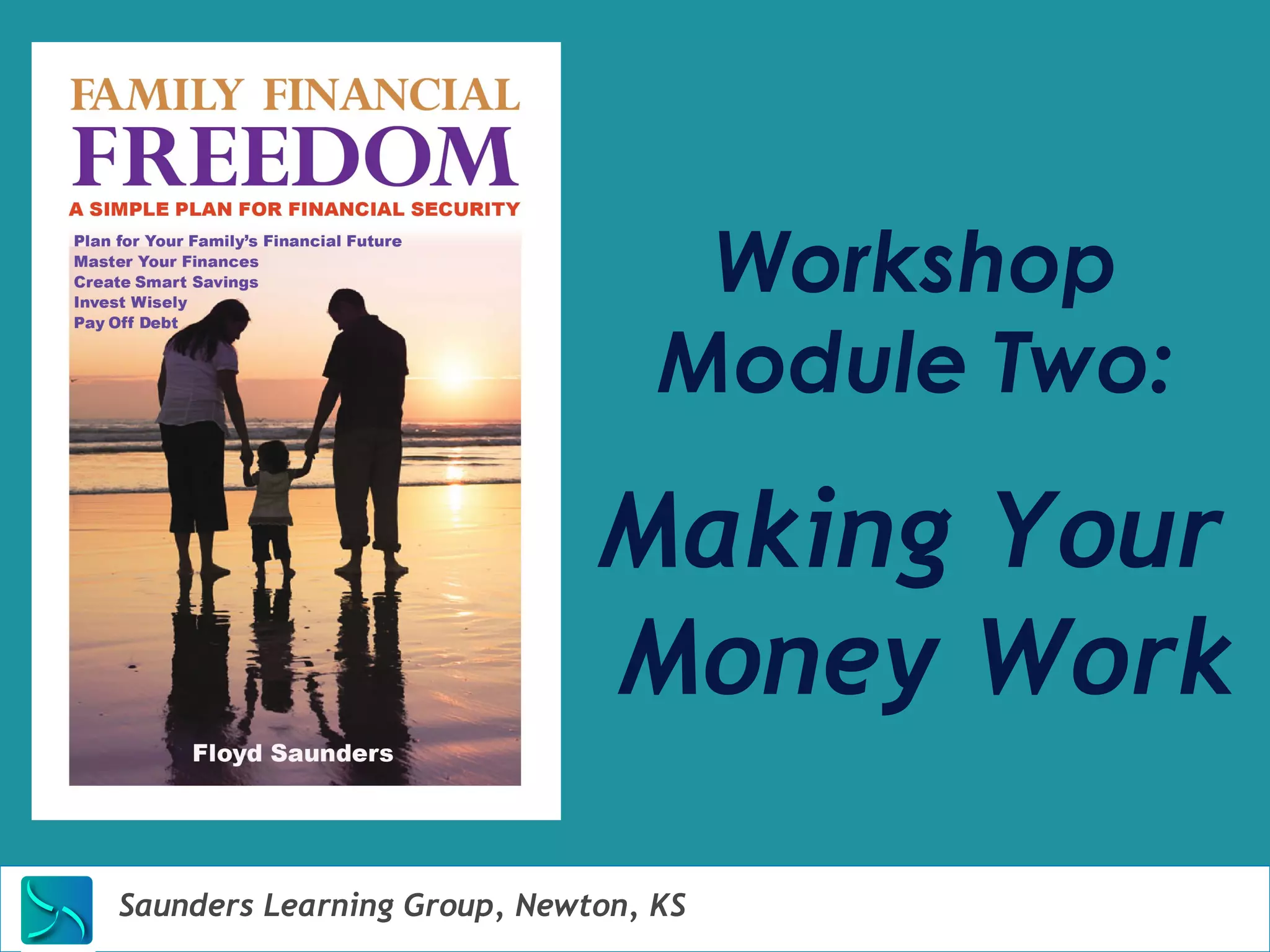 The document outlines a financial workshop by Saunders Learning Group, focusing on personal financial planning, budgeting, and strategies for achieving financial freedom. It emphasizes the importance of developing a positive money attitude and provides steps for effective financial management, including creating a budget, debt reduction, and establishing emergency funds. Additionally, it promotes seminars on family financial freedom and offers resources for further education in financial services.