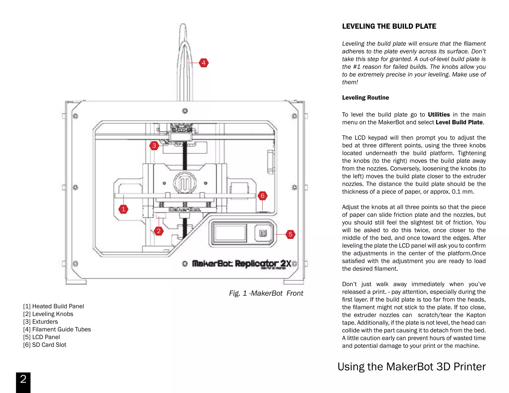 The document provides instructions for using a Makerbot Replicator 2X 3D printer. It describes how to level the build plate, load and unload filament, use the Makerware software to prepare files for printing including orientation, scaling and dual extrusion. It also provides tips for prepping the build surface with ABS slurry, removing prints, installing new Kapton tape, and using an acetone vapor bath to smooth prints.