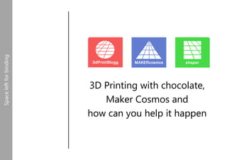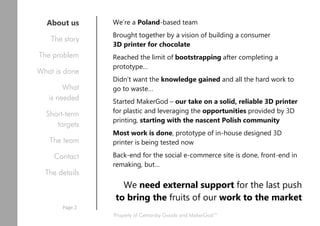 The document outlines a Poland-based team's efforts to develop a consumer 3D printer for chocolate and plastic, including their challenges, milestones, and future plans. They are seeking external support for finalizing their prototype and bringing the product to market, with estimates indicating a financial requirement of around 500,000 EUR for the chocolate printer's development. Additionally, they emphasize the need for mentorship, partnerships, and improved business and marketing strategies to sustain their venture.