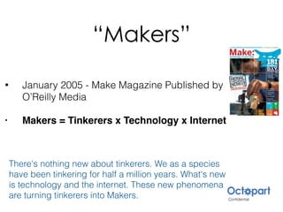 The document discusses the Maker Movement and how technology and the internet have enabled tinkerers to become Makers. Key developments like the Arduino microcontroller in 2005, desktop 3D printing in 2007, and cheap IoT technology in 2012 gave Makers powerful tools previously only available to experts. Online communities also help Makers overcome challenges by collaborating worldwide. While crowdfunding has provided initial funding, hardware accelerators now fill gaps in experience and continued support needed for success. As a result, many Makers are now starting their own successful hardware startups.