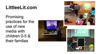 This document discusses promising practices for using new media with young children ages 0-5 and their families in libraries. It recommends that libraries model joint engagement with media to help children develop from media consumers to creators. The library should be a place where new ideas are explored through media instead of just storing information. Specific practices mentioned include modeling media use, telling stories that blend traditional and digital media, offering paper circuitry programs, and incorporating STEAM activities.