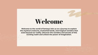The document provides an overview of a fantasy world presentation template. It includes sections on magical creatures like unicorns and dragons, spells, adventures, and concludes by embracing the fantasy realm. Graphics and slides cover topics like unicorn sightings, dragon taming, and a timeline of the fantasy world from wars to rising kingdoms. The presentation aims to transport the audience to an imaginative world beyond reality.