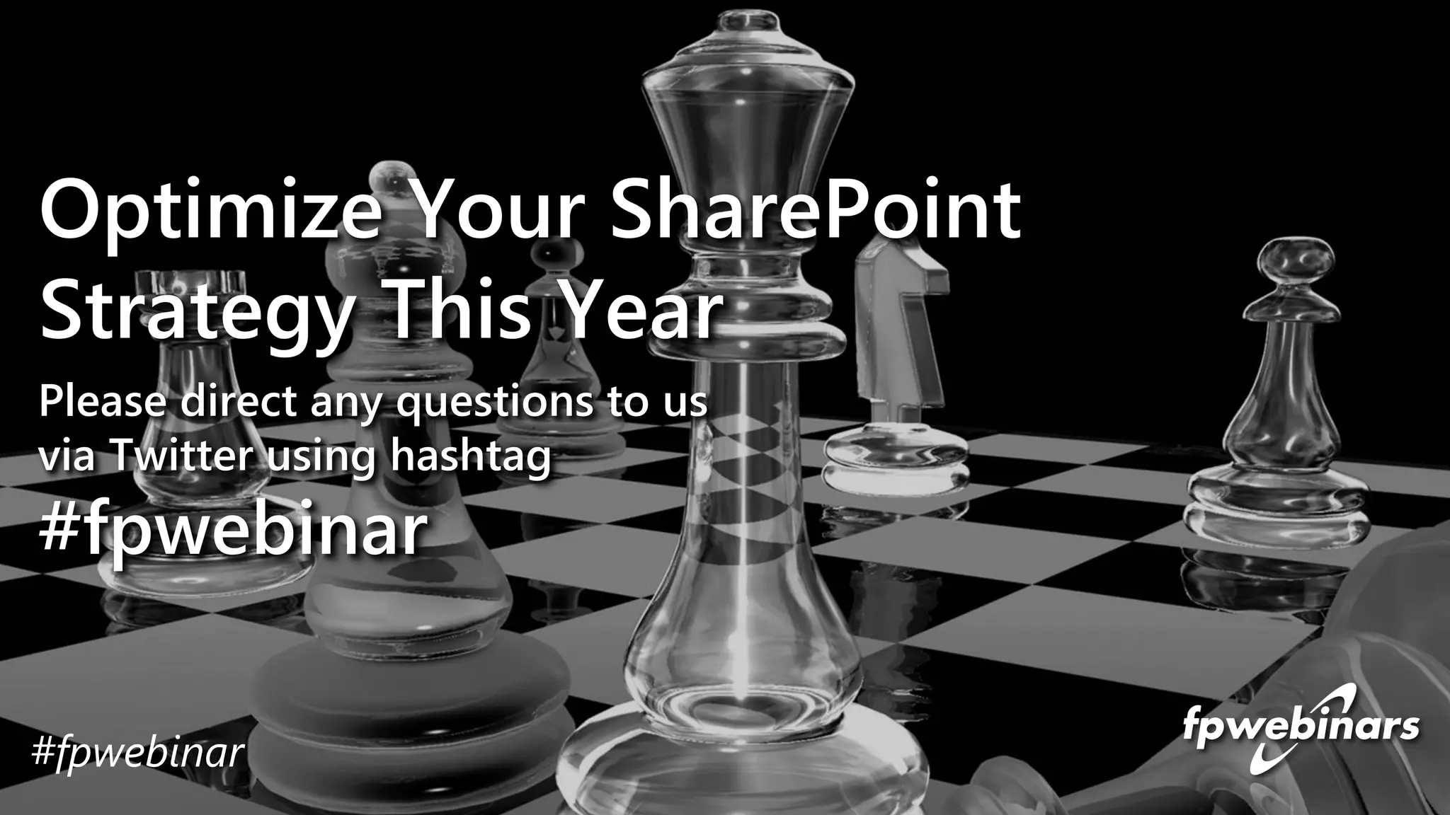 The document outlines a webinar focused on optimizing SharePoint strategy, emphasizing the importance of corporate involvement and strategic alignment for successful implementation. Key topics include defining value, setting expectations, and the role of SharePoint as an enterprise system rather than just a document management tool. Attendees are encouraged to engage through Twitter using the hashtag #fpwebinar and to participate in upcoming related sessions.