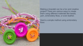 The document provides instructions for making a simple bracelet using embroidery floss. It lists the necessary materials which include embroidery floss or thread in multiple colors, scissors, and beads. The steps explain how to measure and cut the floss, tie an initial knot, braid the floss strands by crossing one strand over the middle and then the other over that in a consistent pattern, add beads while braiding if desired, tie a final knot once the desired length is reached, and tie the bracelet around the wrist to wear it. Customization with different colors, beads, or braiding patterns allows for unique bracelet designs.