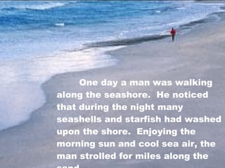 A man was walking along the seashore and saw a small figure repeatedly performing some ritual on the beach. As he approached, he realized it was a young girl picking up starfish stranded by the receding tide and throwing them back into the water. When the man asked why she was doing this, she replied that she wanted the starfish to live and not dry out in the sun. Though the man pointed out there were millions of starfish and her actions couldn't possibly make a difference, the girl simply picked up another starfish and threw it back into the ocean, smiling that she had made a difference for that one.