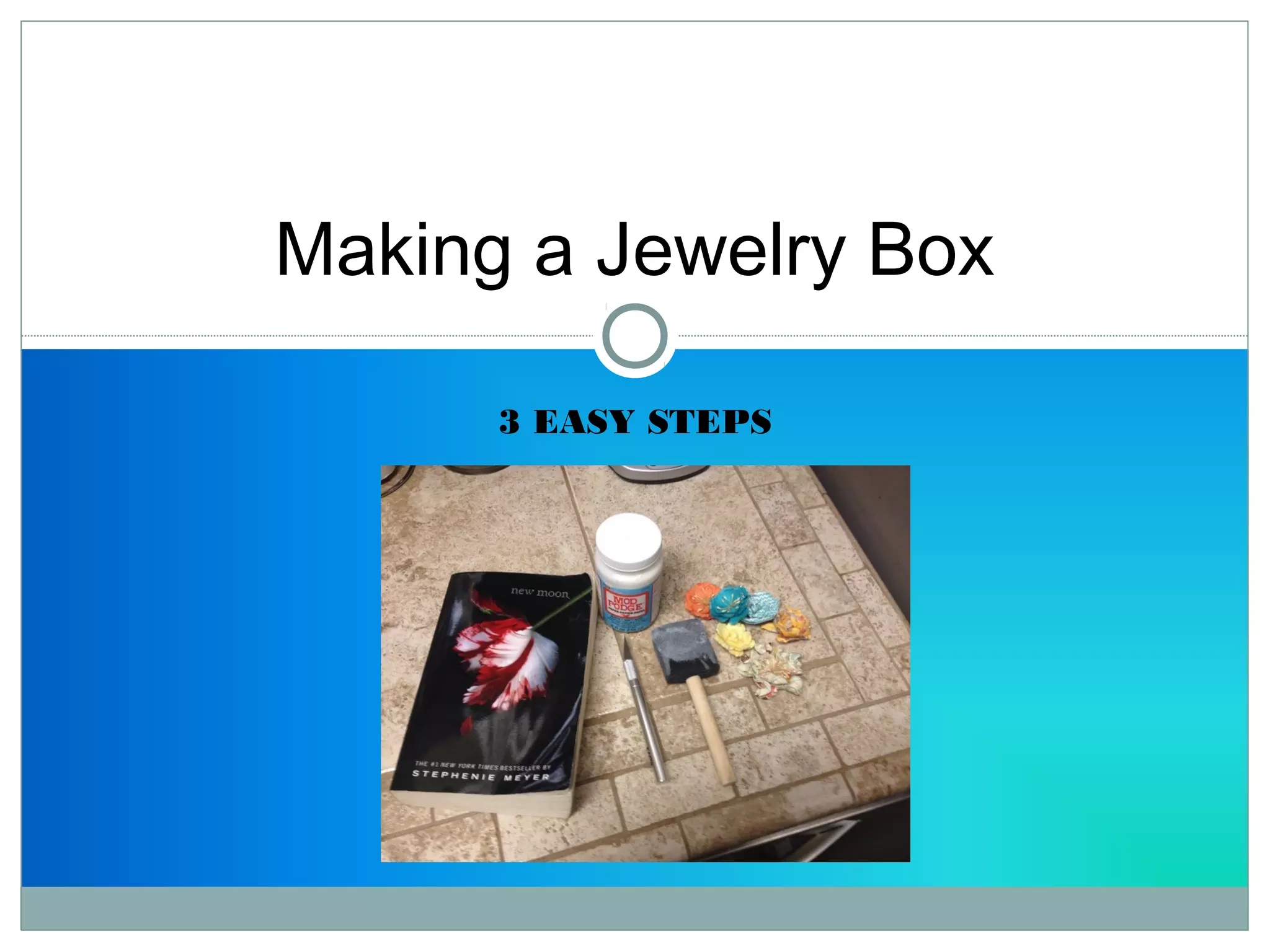 The document provides instructions for making a jewelry box in 3 steps. Step 1 is to cut out the outline of the box from book pages, leaving a border. Step 2 is to apply mod podge to the interior and exterior of the book pages and allow it to dry for 2 hours. Step 3 is to decorate the box with flowers or other embellishments and use the finished box to store jewelry.
