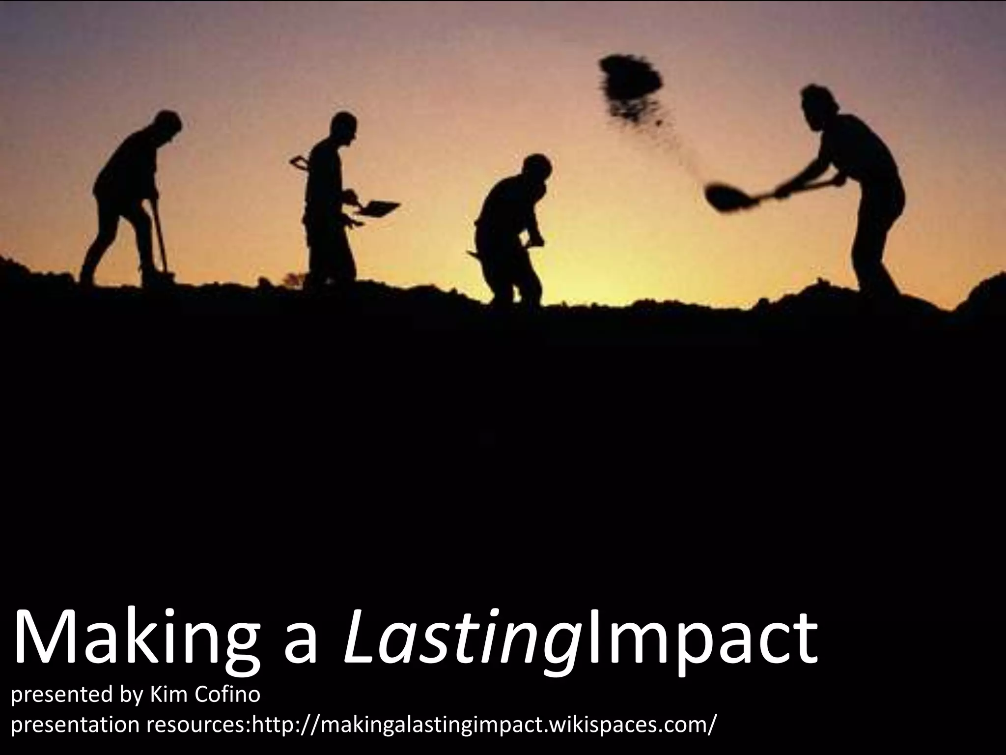 The presentation by Kim Cofino titled 'Making a Lasting Impact' focuses on effective design processes and tools for creating engaging presentations. It emphasizes the importance of clear structure, creativity, simplicity, and the use of media-rich elements. The document also includes a variety of image sources and resources to support the various points discussed.