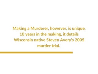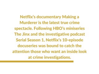 Netflix's documentary 'Making a Murderer' explores the flawed justice system through the case of Steven Avery, who was wrongfully imprisoned for 18 years before being accused of a new murder. The 10-episode series reveals resistance faced by filmmakers in uncovering details of Avery's 2005 trial and the allegation that local police framed him for the crime. This docuseries follows other true crime narratives, providing an in-depth look at crime investigations.