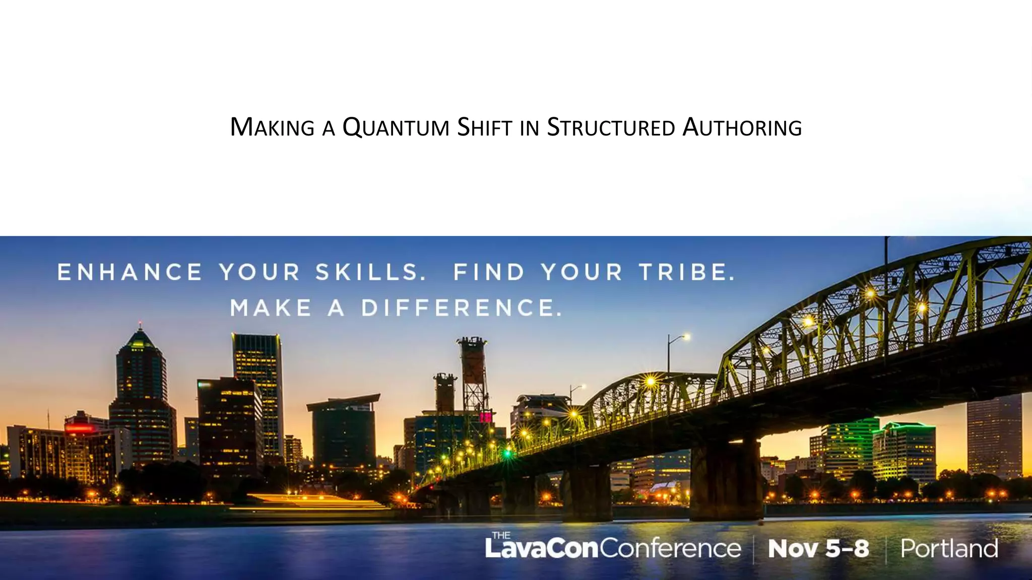 The document discusses advancements in structured authoring, particularly emphasizing the contributions of Eric Kuhnen from Astoria Software. It highlights the importance of curating and sharing documents for training and supporting sales, technical assistance, and marketing efforts. The recurring mention of Lavacon suggests a focus on a conference or event related to these topics.
