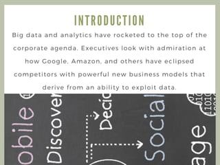 The document discusses the importance of advanced analytics and big data in transforming business models and enhancing competitive advantage, highlighting that companies utilizing these technologies see productivity and profitability improvements of 5% to 6%. It emphasizes the need for businesses to focus on identifying opportunities, choosing the right data, and creating predictive models to optimize outcomes. Additionally, it points out the necessity for organizational culture transformation and managerial understanding to effectively leverage big data's potential.