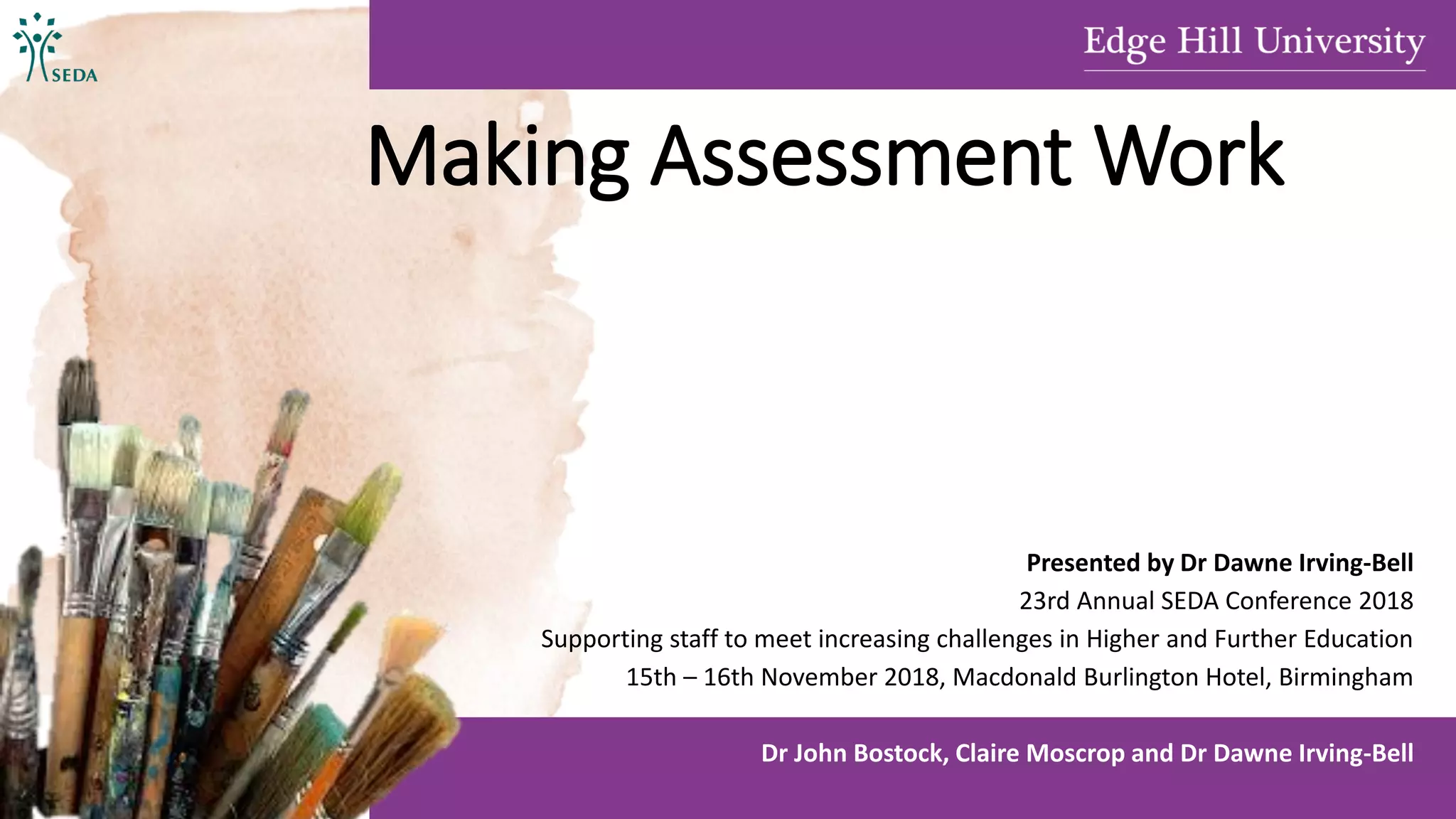 The document outlines a presentation by Dr. Dawne Irving-Bell at the 23rd Annual SEDA Conference focused on supporting staff in higher and further education to enhance assessment literacy. It discusses development strategies, tools, outcomes, and includes activities to determine best practices for assessment design and implementation. The session emphasizes collaboration and ongoing discussions to establish baseline standards for assessment literacy among staff and students.