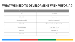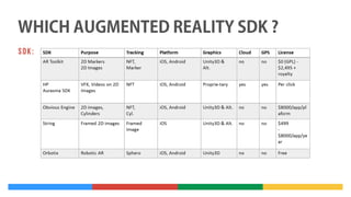 This document provides an overview of augmented reality (AR) and discusses several key aspects of AR including: