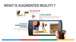 - The history and foundational concepts of AR including how it differs from virtual reality by allowing users to see the real world with virtual objects overlaid.