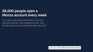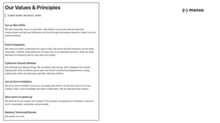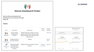 The document discusses how the Monzo data team uses Looker to enable better and faster decisions across the company. It describes how the team is structured to be embedded within business areas to provide feedback and support. Around 70% of Looker accounts are active weekly. The team aims to move from responsive analytics to self-service analytics through building wide data models, experiment dashboards, and automating tasks like training and detecting broken charts using neural networks. The overall goal is to continuously improve how the team and others can get the most value from company data.