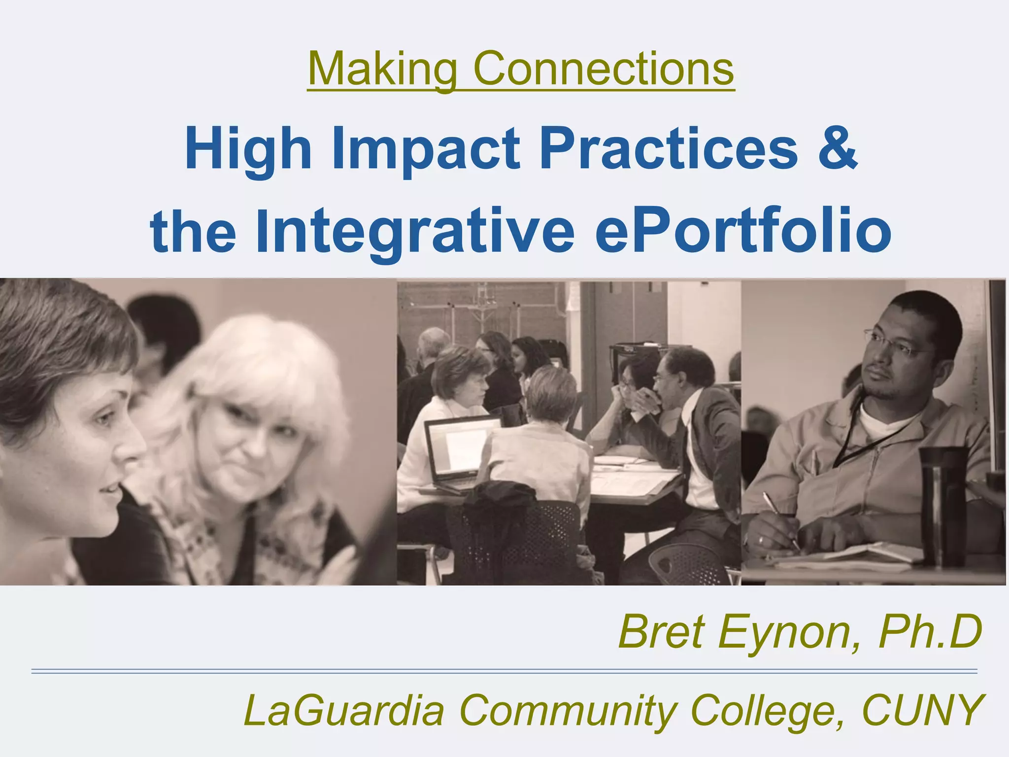 This document discusses the use of ePortfolios to support integrative learning in higher education. It begins by outlining several organizations and resources focused on ePortfolio research and implementation. It then discusses how ePortfolios can help students make connections across courses, disciplines, and between their academic and lived experiences. The document provides examples of ePortfolio implementation from various colleges and programs. It finds that ePortfolio pedagogy is aligned with high-impact educational practices and can improve student engagement, learning outcomes, and retention rates when implemented systematically with appropriate support structures.