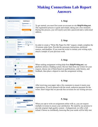 This document discusses steps to request writing assistance from the website HelpWriting.net. It outlines the 5-step process: 1) Create an account with a password and email, 2) Complete a 10-minute order form providing instructions, sources, and deadline, 3) Review bids from writers and choose one, 4) Review the completed paper and authorize payment, 5) Request revisions to ensure satisfaction and receive a refund for plagiarized work. The website aims to fully meet customer needs through an original, high-quality paper.