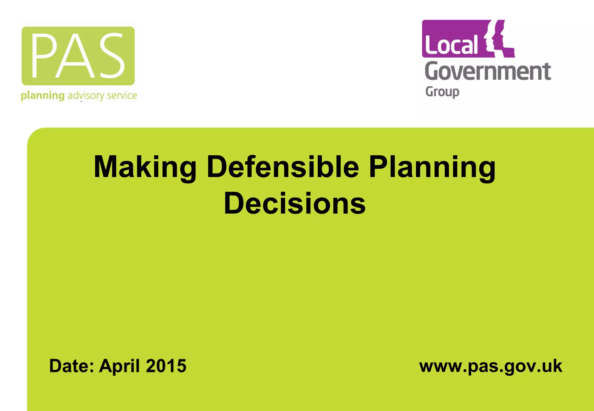 The document provides guidance on making defensible planning decisions. It discusses the context for planning decisions, the role of councillors, balancing material considerations, and avoiding unreasonable behavior. Key points include starting decisions with the development plan, considering officer recommendations, seeking advice, and ensuring any reasons for refusal can be defended at appeal based on material planning considerations.