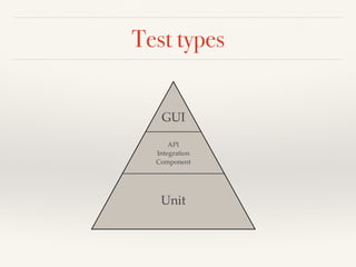 This document discusses different approaches and mindsets for writing feature tests versus unit tests. It notes that feature tests are larger in scope and harder to control than unit tests, but can provide more value when "tamed". It encourages adopting the right mindset that recognizes the differences between test types and focusing feature tests on priority areas using the appropriate tools.