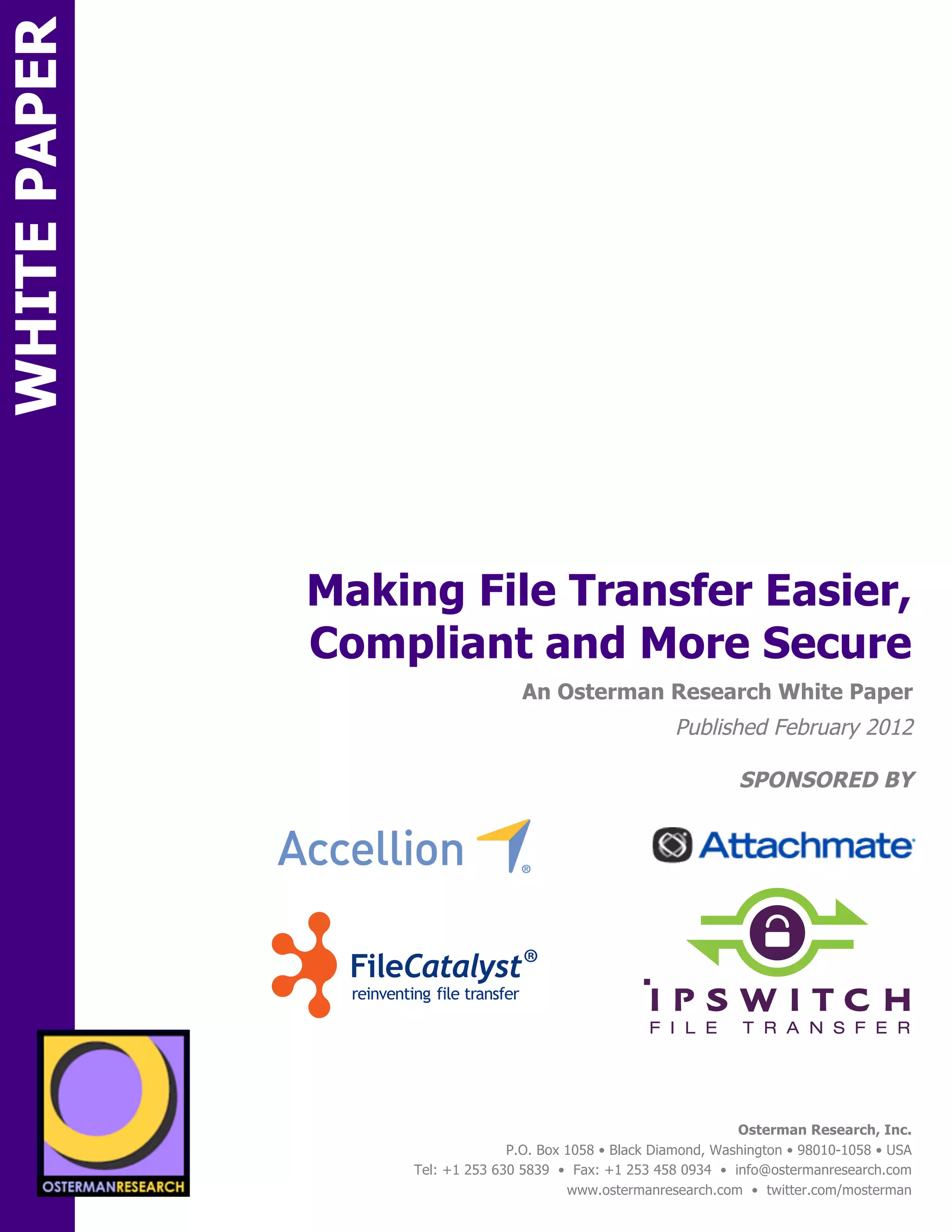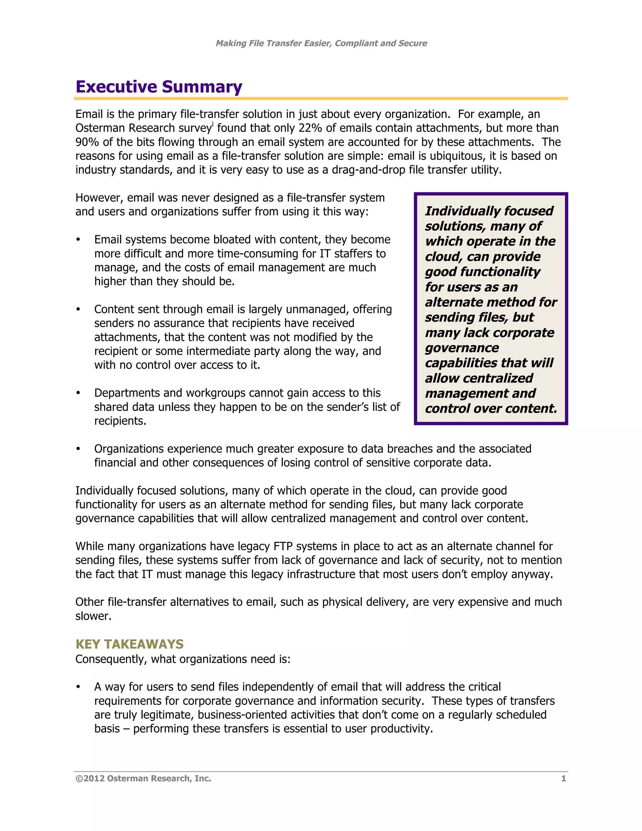 This white paper discusses the need for a dedicated, secure file transfer solution to address the inefficiencies and risks associated with using email as a primary file transfer mechanism in organizations. It highlights the challenges of existing systems, including lack of governance, increased risk of data breaches, and escalating management costs, while advocating for better alternatives that integrate easily into workflows and comply with regulatory requirements. The document also emphasizes the importance of solutions that manage content throughout its lifecycle and improve corporate governance.