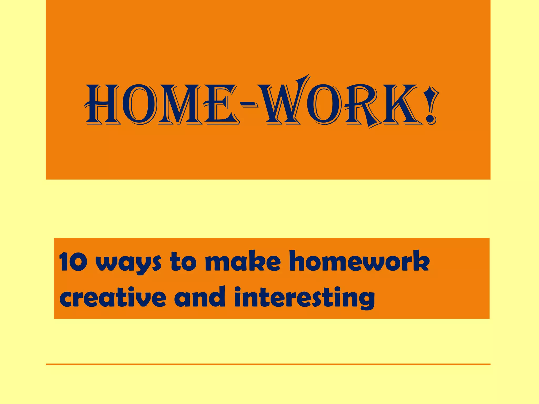 The document provides 10 categories of creative and interesting homework assignments: observation based, interaction based, research based, collaboration based, news based, imagination based, art based, design based, application based, and theme/project based. It lists multiple specific task ideas under each category, such as observing trees in the neighborhood, creating a family tree by interacting with family members, researching a pre-historic animal, designing a word search about weather terms, and more. It concludes by encouraging thinking of additional creative ways to make homework fun and exciting for children.