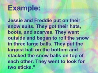 Making inferences means using clues from a story to figure out information that is implied but not directly stated. Readers must picture the story in their head and find clues to make inferences about whether a character feels a certain way, what is happening in the story, or details about settings and events that are not explicitly described but suggested. The document provides examples of inferences a reader could make about the characters of Henry and Mudge and asks questions to prompt inferring details about the season, why certain objects are needed, and what characters are doing based on clues in the story.