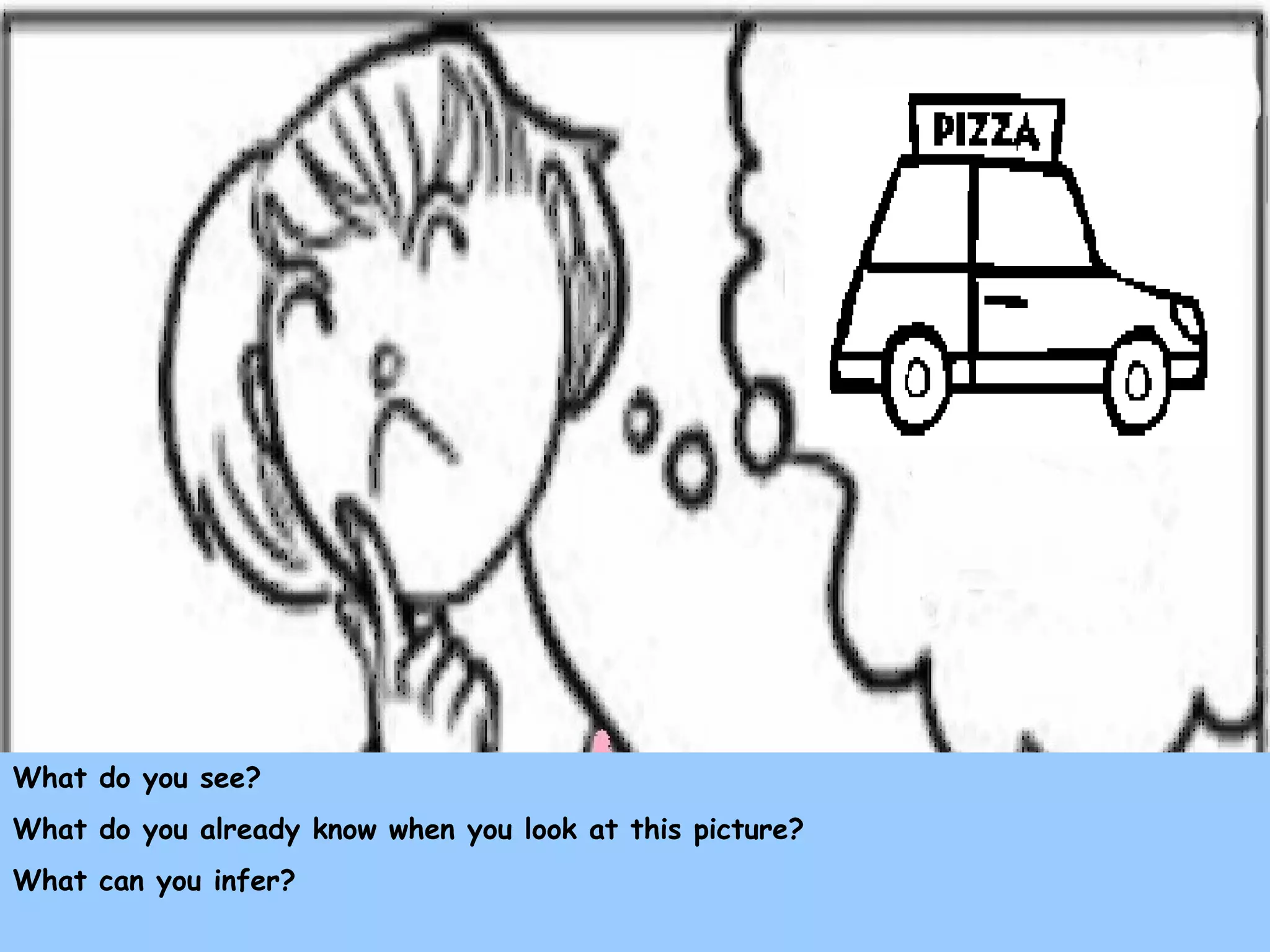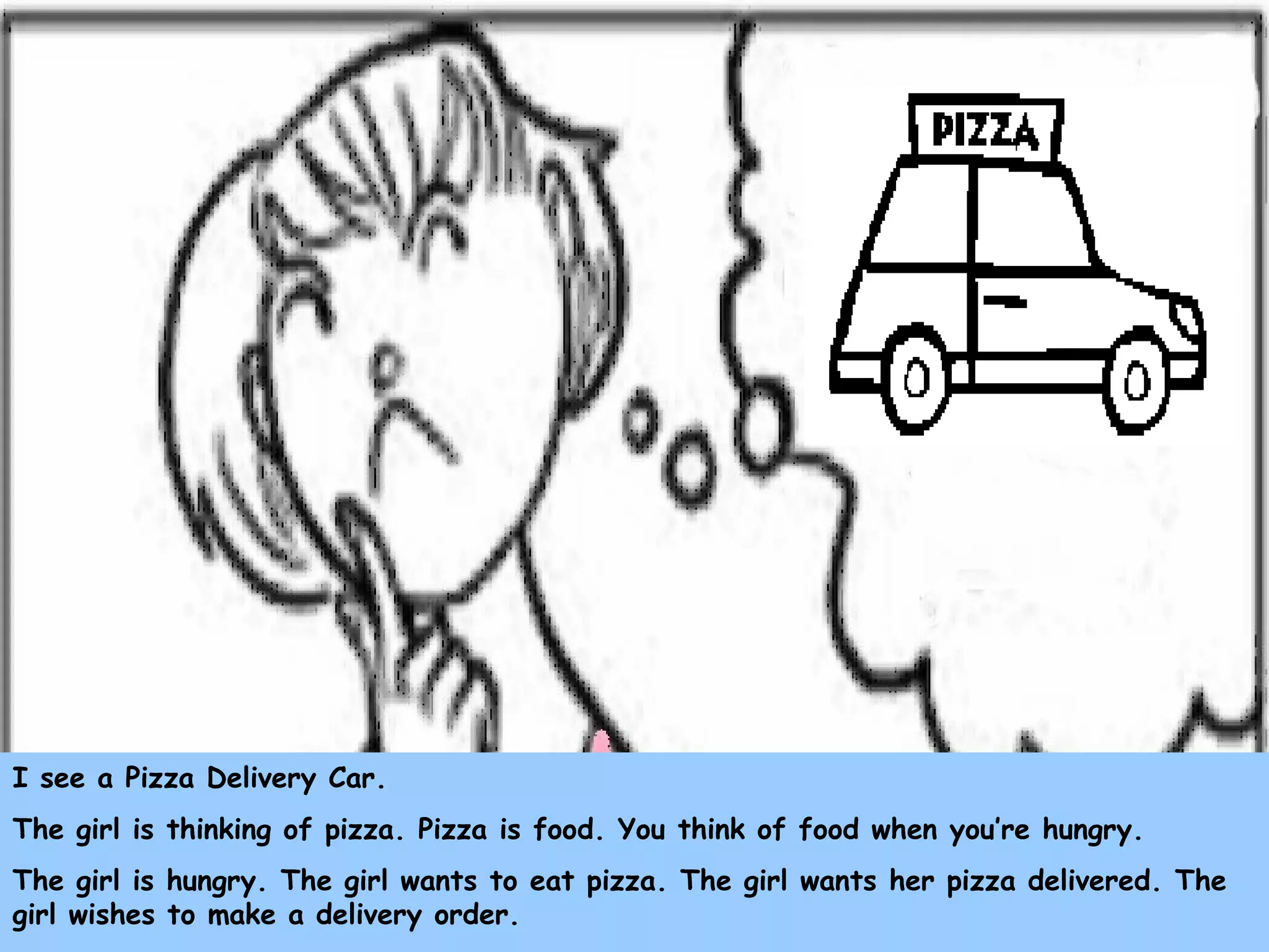 The document contains inferences made about several pictures. In the first picture, a girl is seen looking at a pizza delivery car, from which it is inferred that the girl is hungry and wants her pizza delivered. In the second picture, the girl is paying a pizza delivery man for a pizza in a box, allowing the inference that she is paying for the delivered pizza. In the third picture, the girl does not look pleased while eating a triangular slice of pizza, leading to the inference that the pizza tasted bad.
