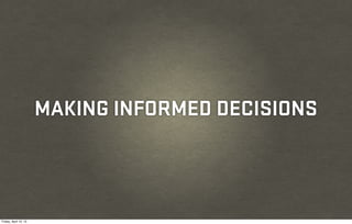 The document discusses user research and making informed decisions. It describes defining problems, understanding audience needs, and using user research and analytics. It discusses quantitive and qualitative research methods like surveys, interviews and usability testing to understand problems from different perspectives. Combining these methods and data types can help build a methodology to solve problems. The presentation was created using this user research approach to understand the audience and content that would be most helpful for them.