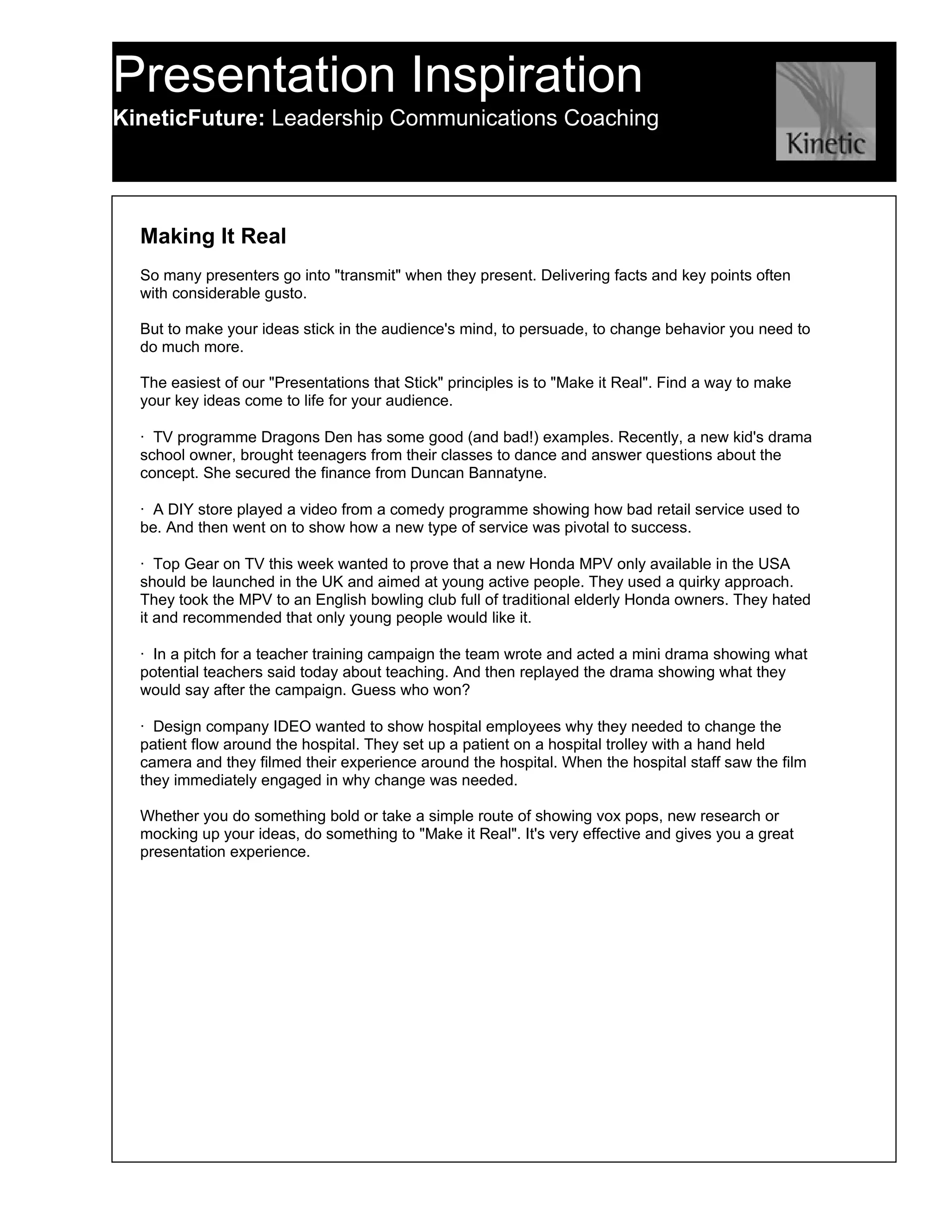 This document discusses ways to make presentations more engaging by making ideas and concepts more concrete and relatable for audiences. It recommends finding ways to "make it real" such as using examples, demonstrations, role plays, videos, or visual aids to bring key ideas to life. Examples mentioned include a drama school bringing students to demonstrate their program, a retailer showing a comedy video about poor service, and a design company filming a patient's hospital experience to show the need for workflow changes. Making concepts more tangible and experiential can help audiences better understand, relate to, and remember ideas.