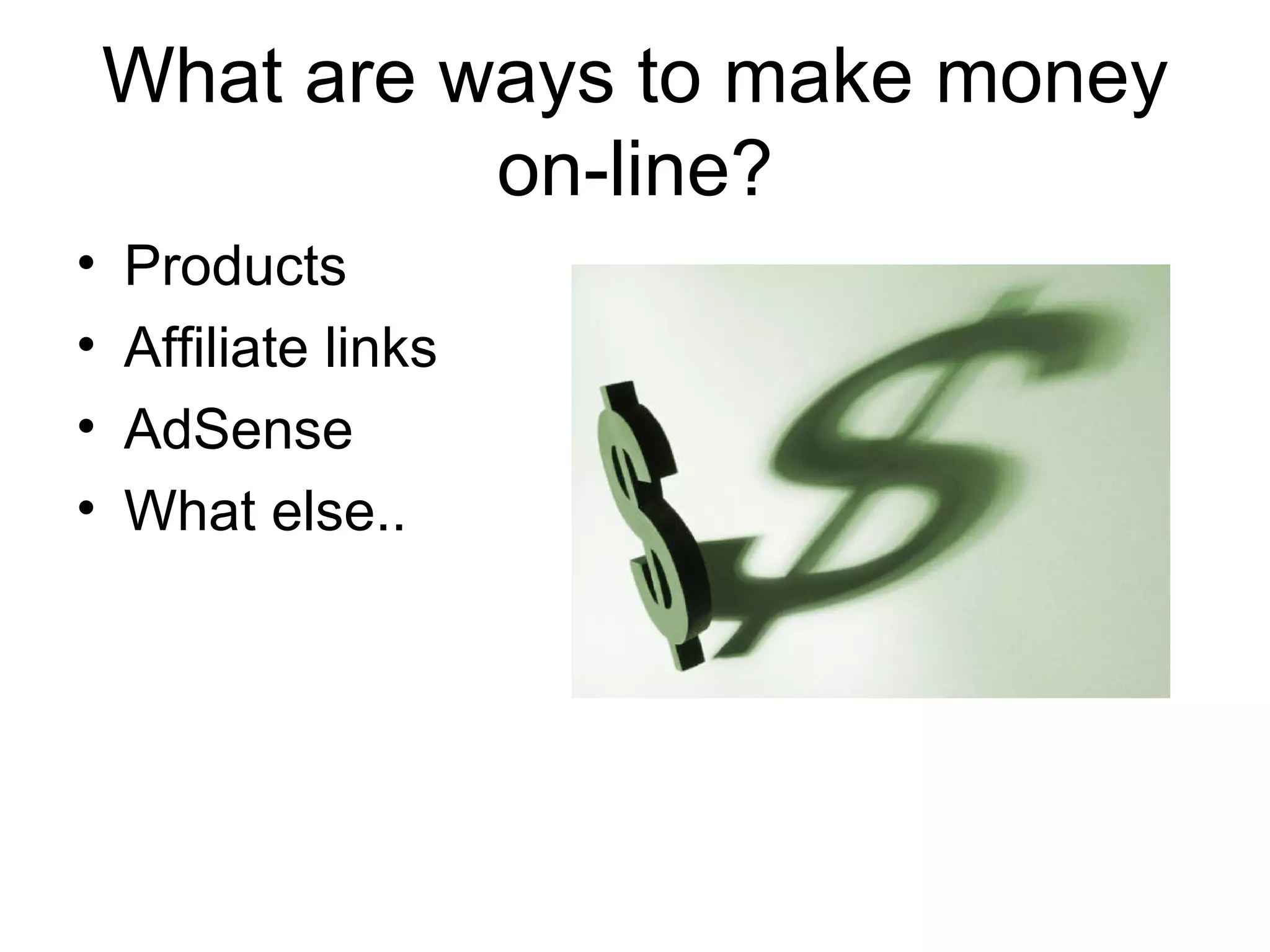 This document provides an overview of a class on making money online while you sleep. It discusses various ways to make money, including selling products, using affiliate links, AdSense, blogging, creating websites, and more. It also provides many resources and websites related to topics like affiliate marketing, pay-per-click advertising, social media marketing, and more.