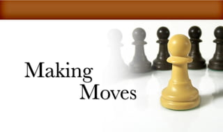 The document outlines five basic moves for making moves or ensuring future success: 1) decide if you want to achieve your goals, 2) journal to record your progress, 3) eliminate excuses that are holding you back, 4) create new relationships and circles of influence, and 5) win the internal warfare in your mind by dismantling strongholds of incorrect thinking patterns and replacing them with right reasoning. It defines a stronghold as an ancient fortress designed for protection against opposition, giving examples of arguments, reasoning, and pretentious thinking as strongholds to overcome.