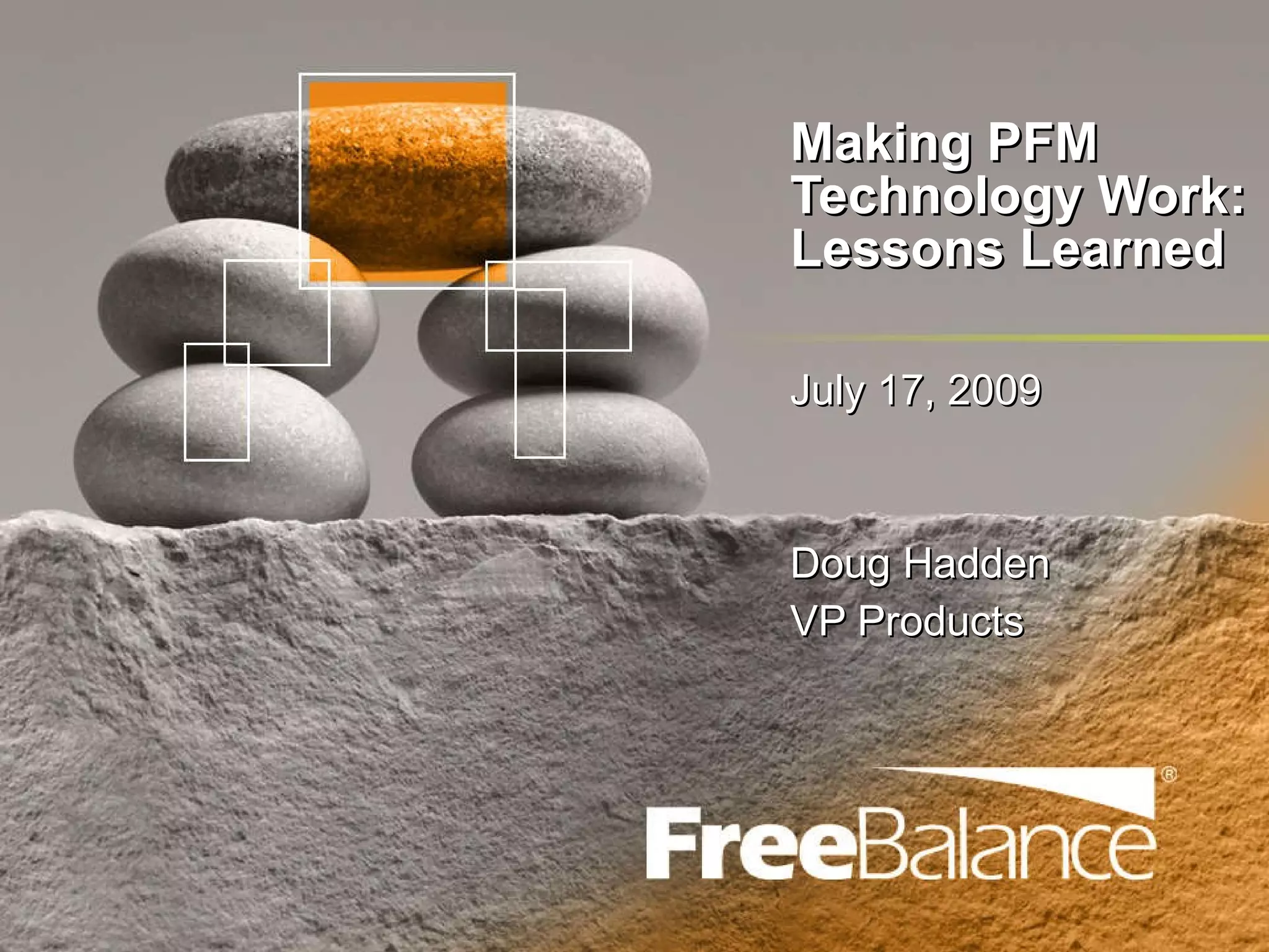 The document discusses the challenges faced by financial management systems in emerging countries, highlighting the failure rates of commercial solutions and the success of FreeBalance due to its focus on government needs. It emphasizes the importance of rapid implementation, adaptability to reform, and sustainability of financial management software. Lessons learned include the need for better communication of requirements and the importance of vendor expertise in government financial systems.