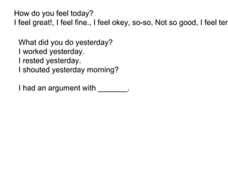 1. It asks how the person feels and what they did yesterday, listing some possible feelings and activities.