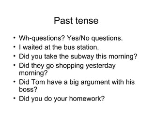 2. It then moves to questions about past events using words like "did" and questions starting with "wh-"
