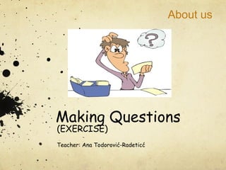 The document provides examples of how to form questions in English using question words like what, when, where, which, who, whose, why, and how. It gives sample sentences and their question form, focusing on questions for the present simple, present continuous, past simple, and future simple tenses. It then provides an exercise for students to practice forming questions based on sample statements.